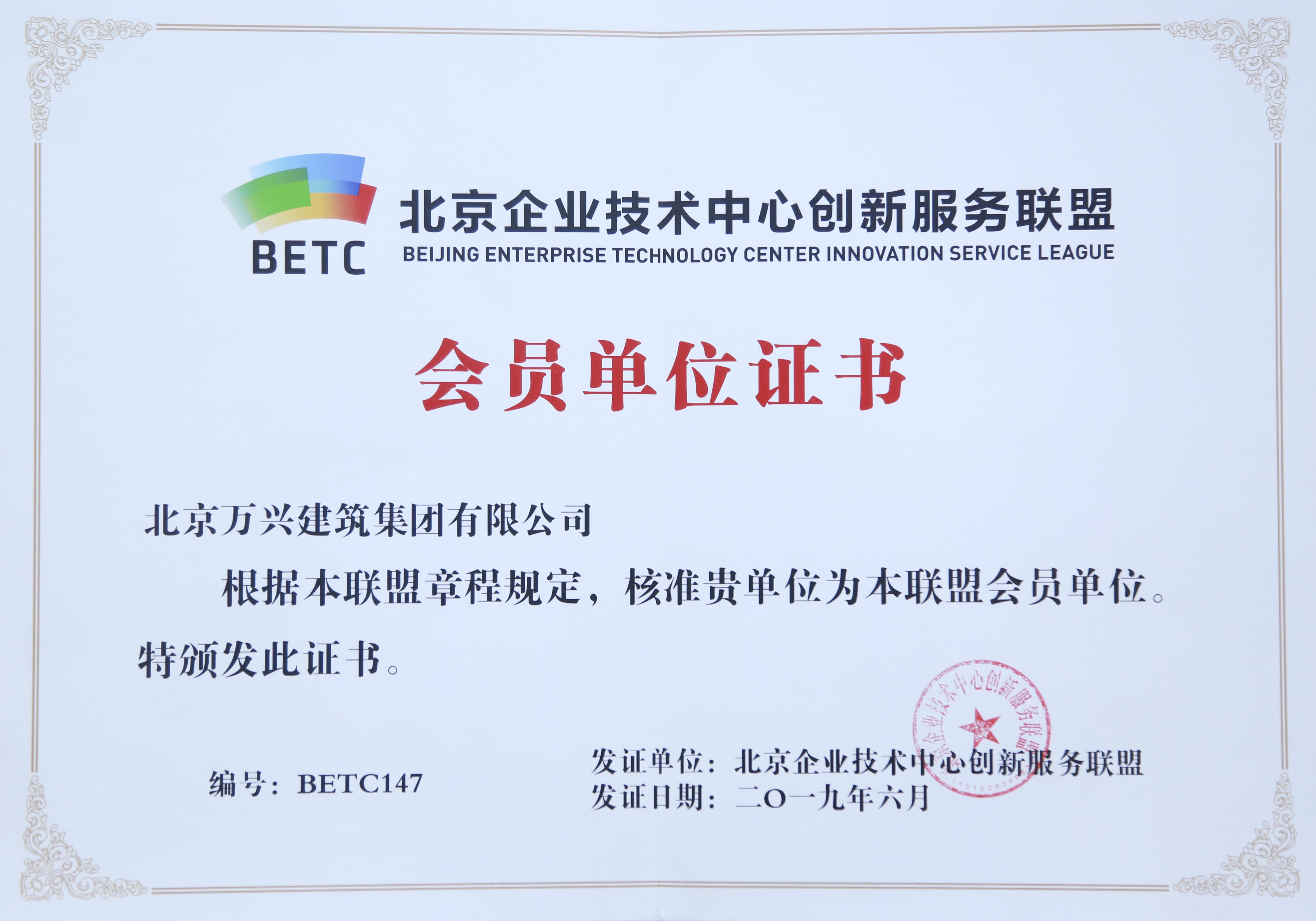 北京企業技術中心創新服務聯盟會員證書