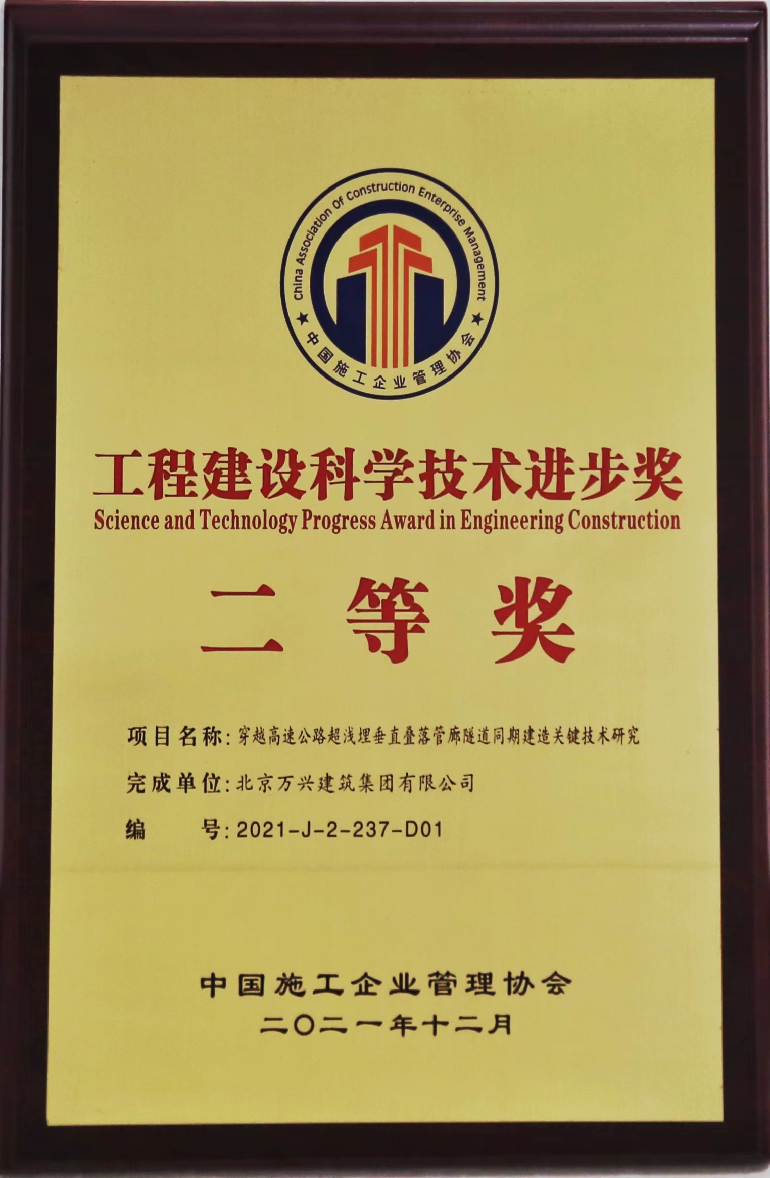 近日,中國施工企業(yè)管理協(xié)會(huì)向集團(tuán)頒發(fā)了《工程建設(shè)科學(xué)技術(shù)進(jìn)步獎(jiǎng)二等獎(jiǎng)》證書。以集團(tuán)董事長作為第一完成人主持完成的“穿越高速公路超淺埋垂直疊落管廊隧道同期建造關(guān)鍵技術(shù)研究”科技成果榮獲中施企協(xié)工程建設(shè)科學(xué)技術(shù)進(jìn)步獎(jiǎng)二等獎(jiǎng)。