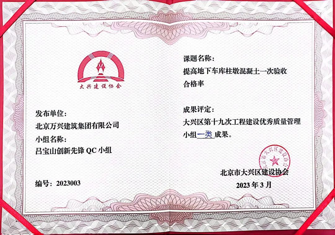 集團十五分公司呂寶山創新先鋒小組成果:《提高地下車庫柱墩混凝土一次驗收合格率》榮獲一類成果